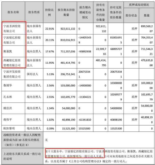 先來(lái)看看ST銀億的前十大股東,里面的前四大,分別是,寧波銀億控股有限公司、寧波圣洲投資有限公司、熊基凱(熊老板兒子)、西藏銀億投資管理有限公司為一致行動(dòng)人關(guān)系。