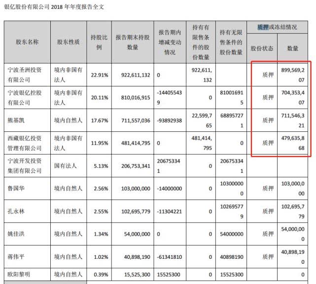 年報(bào)顯示,截至目前,銀億股份前十大股東中,銀億控股、寧波圣洲、熊基凱、西藏銀億投資、歐陽(yáng)黎明為一致行動(dòng)人,分別持有銀億股份22.91%、20.11%、17.67%、11.95%、0.39%,合計(jì)為73.03%,其分別質(zhì)押9億股、7.04億股、7.12億股、4.80億股,合計(jì)占總股本的69.39%,股權(quán)質(zhì)押比為95.02%。