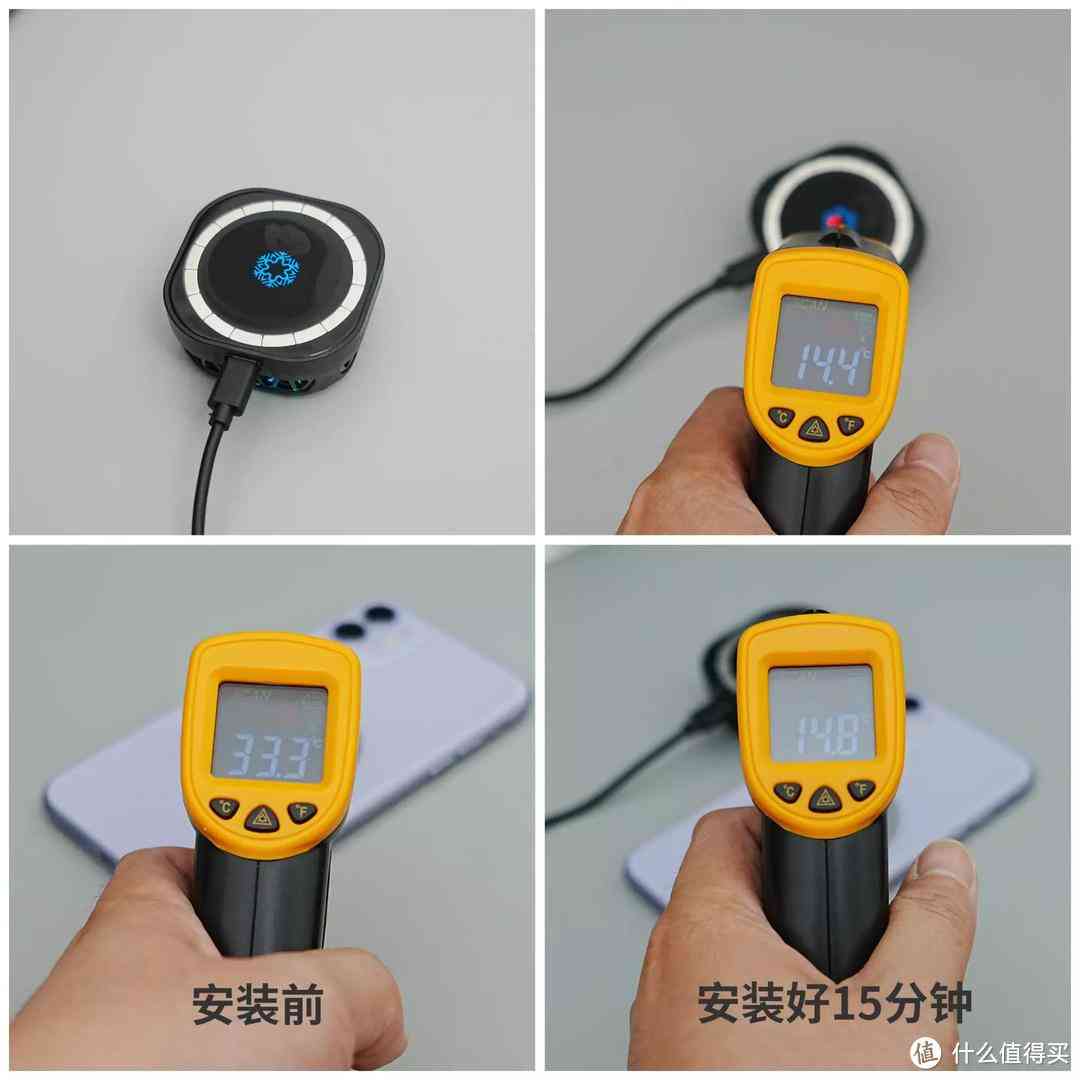 散熱器散熱效果也很出眾,運行15分鐘后散熱器內表面已經(jīng)出現(xiàn)冰霜,用溫度計實測降到14.4°C。安裝在手機上測試,運行15分鐘后手機背板從33.3°C降到14.8°C。給女友手機安裝上它,不論室內還是室外,手機都能不懼高溫酷暑,保持低溫運行,算是給她增加了技能buff!
