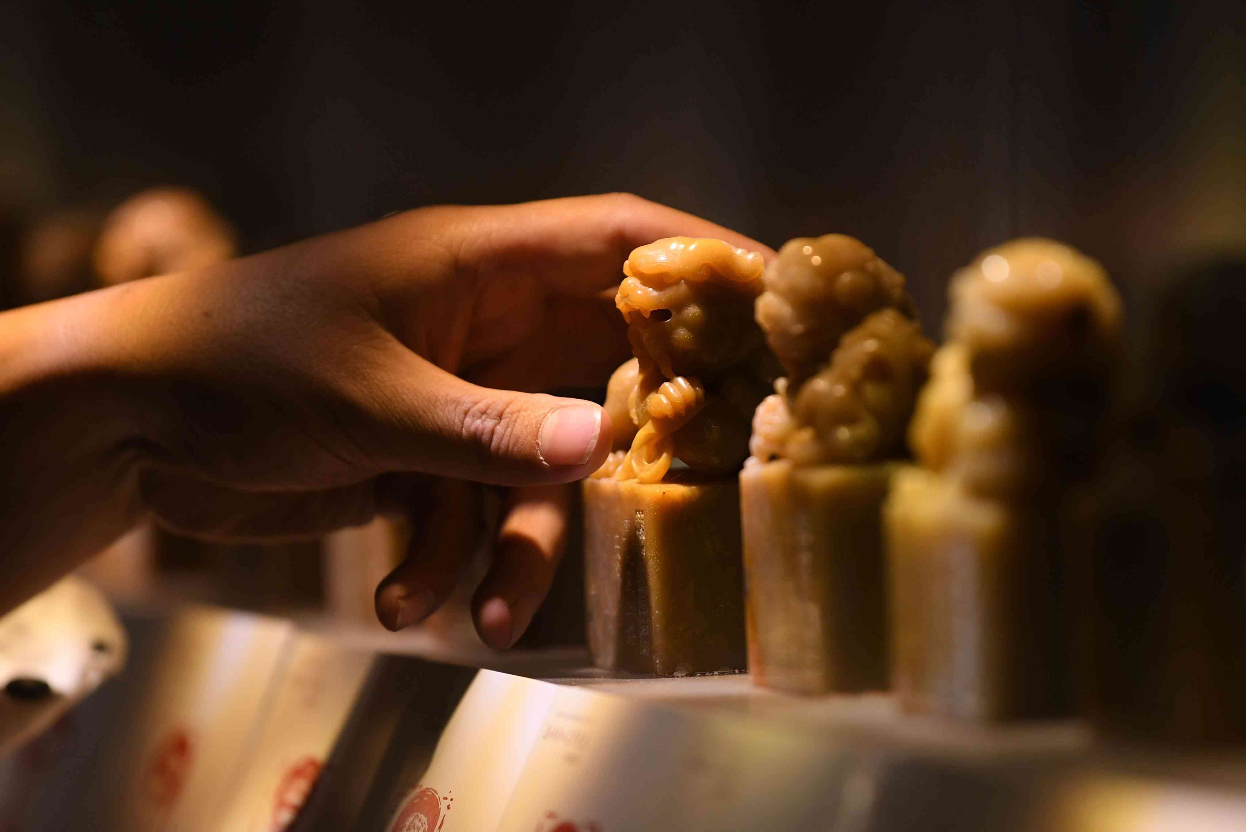 ↑浙江省工藝美術(shù)大師錢友杰在工作室拾取一枚雕有獅子圖案的印章(11月5日攝)。