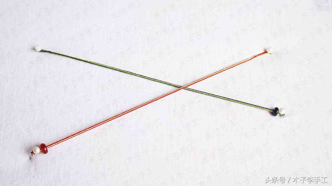 2、以死結(jié)為中心對折后8根線全部穿入一顆尾珠。