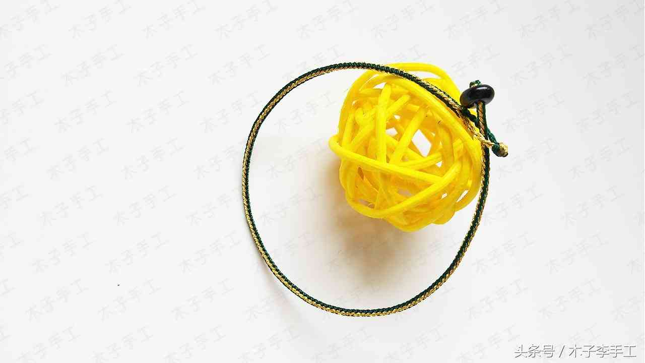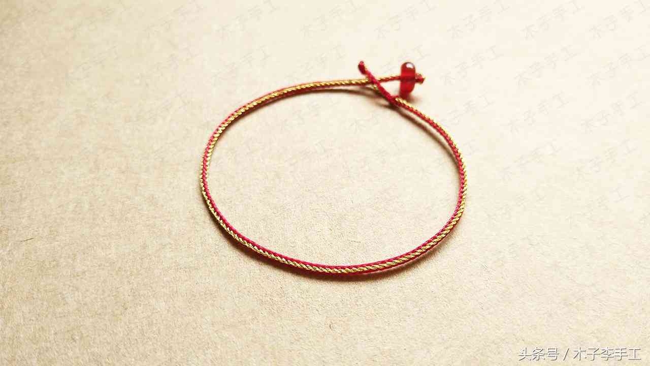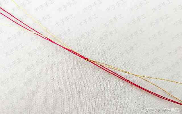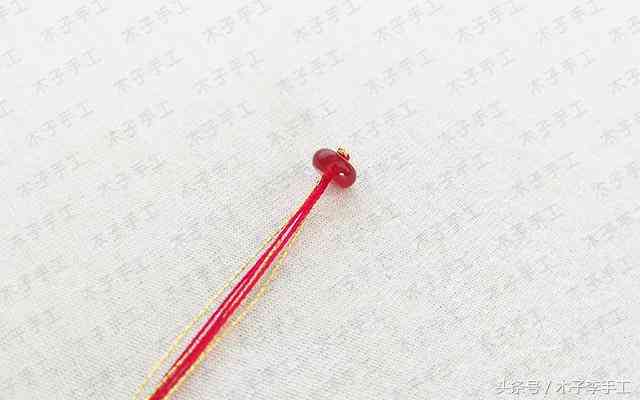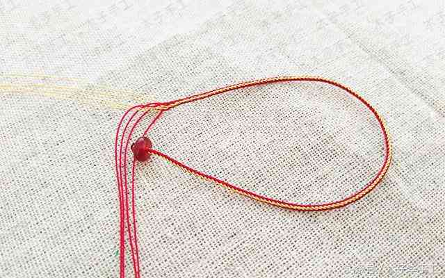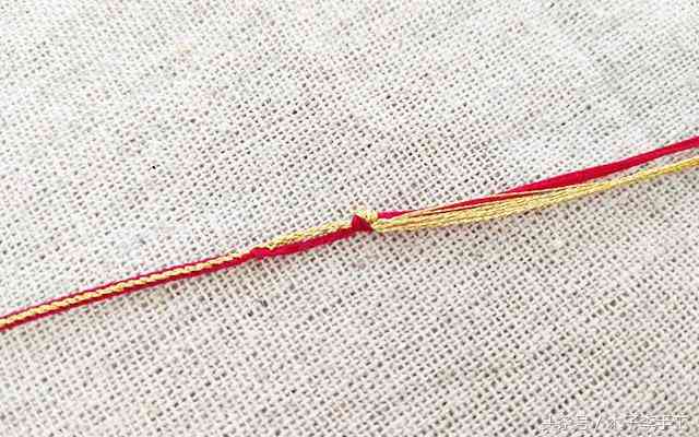6、四股辮做完后金線和紅線一起做一個金剛結(jié),扣眼就做好了,然后多余的線剪掉燒粘好就可以了。