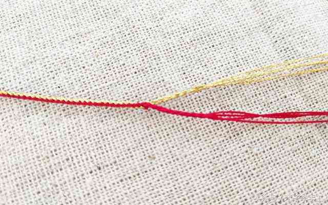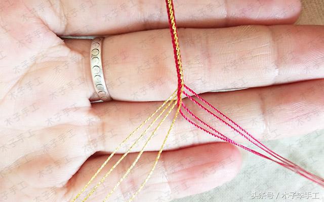 3、把8根線分成左右兩邊,一邊4根紅線,另一邊4根金線,然后做八股辮。