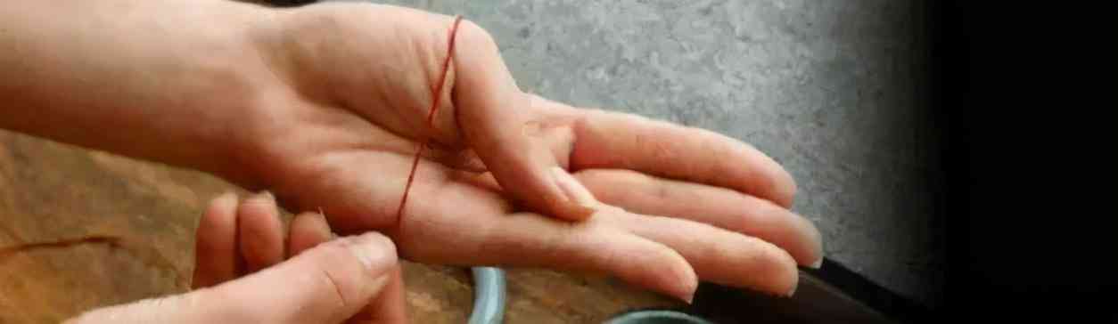 可以選擇比較細(xì)的毛線,或者比較細(xì)的絲帶,作為工具進(jìn)行測量。我們把雙手放平,保持一個(gè)比較放松的姿態(tài)。然后將大拇指的指間按住小指的指根位置。