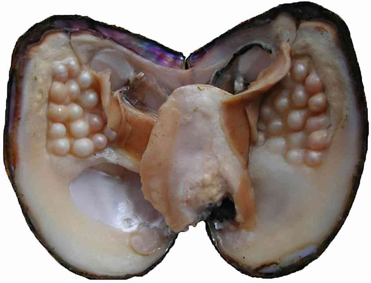 根據(jù)野生珍珠產(chǎn)生原理,人們研究出了產(chǎn)生珍珠的方法,一般先從蚌外套膜剪下活的上皮細胞小片,接著與準備好的人工核(蚌殼)一同植入外套膜結(jié)締組織中,最終人工核被河蚌分泌的黏液包裹形成珍珠。