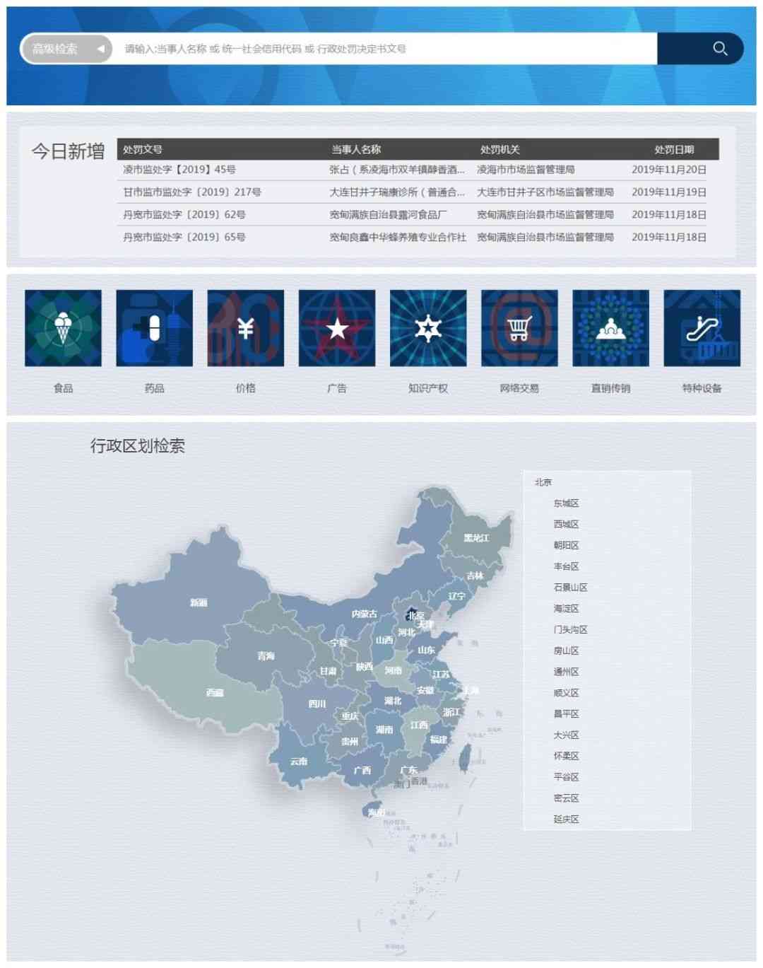 第三個(gè)欄目是分類檢索,按行業(yè)和內(nèi)容共分成了食品、藥品、價(jià)格、廣告、知識(shí)產(chǎn)權(quán)、網(wǎng)絡(luò)交易、直銷傳銷、特種設(shè)備八類主題,點(diǎn)擊其中任何一類,便可進(jìn)入子頁面并顯示該分類的全部的文書信息,此外還可以在子頁面內(nèi)進(jìn)行關(guān)鍵詞的搜索查詢;第四個(gè)欄目即為按行政區(qū)劃檢索,用戶可以根據(jù)不同省、市、地區(qū)的信息進(jìn)行檢索查詢,例如點(diǎn)擊北京市朝陽區(qū)后,便可進(jìn)入子頁面,看到該區(qū)域范圍內(nèi)企業(yè)的處罰文書情況,這個(gè)子頁面也可以進(jìn)一步地進(jìn)行關(guān)鍵詞搜索。