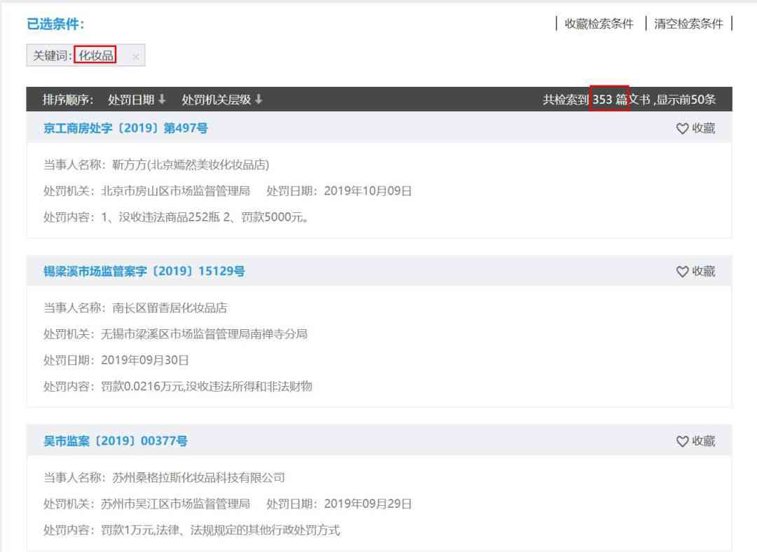 青眼以“化妝品”為關(guān)鍵詞進(jìn)行檢索發(fā)現(xiàn),截至目前,已有353篇與化妝品相關(guān)的處罰文書上傳至平臺(tái),處罰時(shí)間以2019年為主。案件來自北京、江蘇、浙江、遼寧等省市。處罰原因覆蓋了廣告違法、商標(biāo)侵權(quán)、抽檢不合格、虛標(biāo)有效期、無合法來源證明等各種情形。