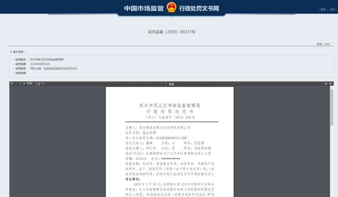 值得一提的是,在文書網(wǎng)上線之前,公眾一般通過天眼查、企查查等第三方信息查詢平臺(tái)也可以搜索到企業(yè)的相關(guān)違規(guī)信息。相比較而言,文書網(wǎng)上的相關(guān)內(nèi)容更為詳細(xì)。以上述蘇州桑格拉斯化妝品科技有限公司被處罰一案為例,第三方信息查詢平臺(tái)中僅列出了企業(yè)被處罰的日期、決定文書號(hào)、行政處罰事由及內(nèi)容、違法行為類型決定機(jī)關(guān)等重要信息,而文書網(wǎng)中呈現(xiàn)的則是企業(yè)被處罰的完整文書信息,且能打印和下載。