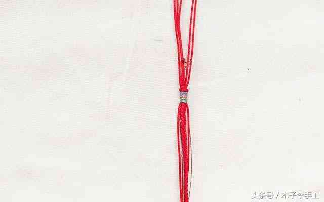 3、把手鏈倒過來,拉2根紅線下來,再另取一根彩金線對(duì)折后跟這2根紅線并排放好。