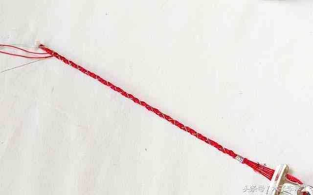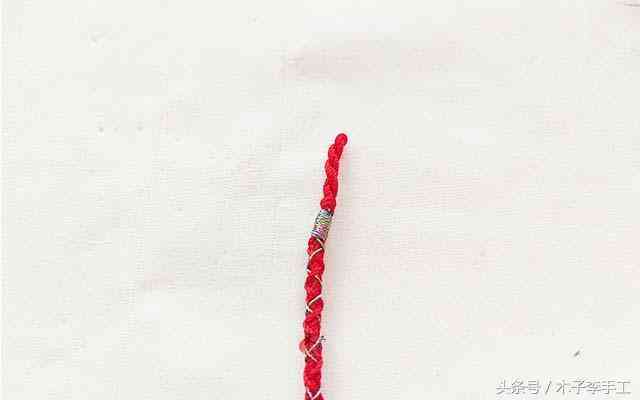 5、然后用那2根紅線和2根彩金線以八股辮為夾心做夾心四股辮,要做均勻一點(diǎn)。