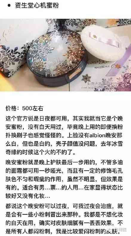 圖片來自博主@GloriAriesCLUB這款晚安粉算是非常良心的了,含有玻尿酸和膠原蛋白,護膚效果還是不錯的。白天也可以當作蜜粉使用,晚上護膚后輕輕拍上一層,可以避免護膚品沾到枕頭上和緩解護膚品帶來的黏膩感,也有修正膚色的作用。但是遮瑕很弱,美白功能也沒有前兩款強大,畢竟這款比較平價嘛。?(????)