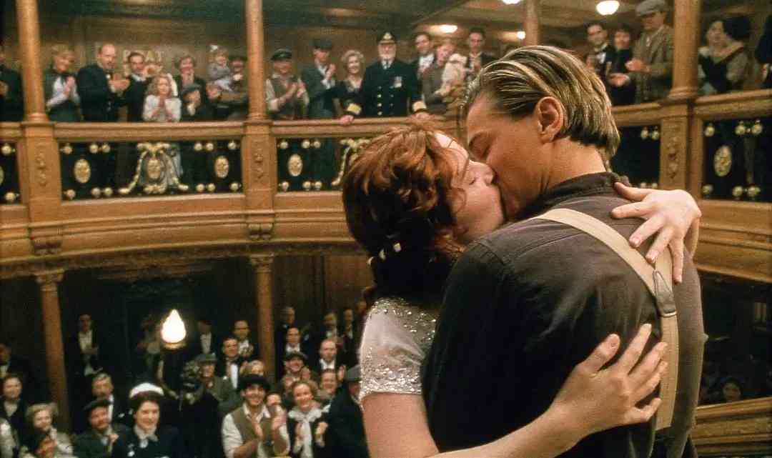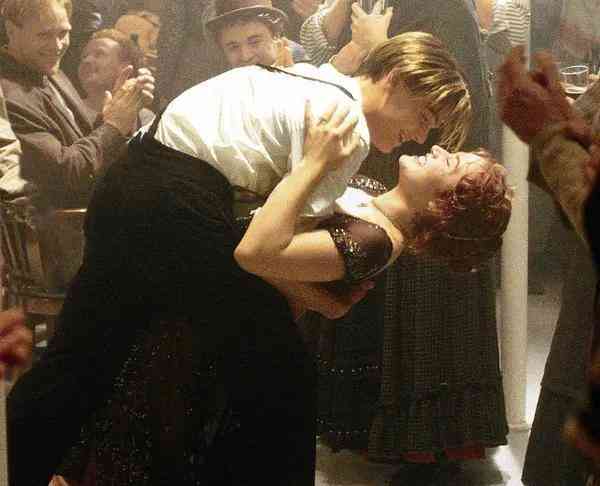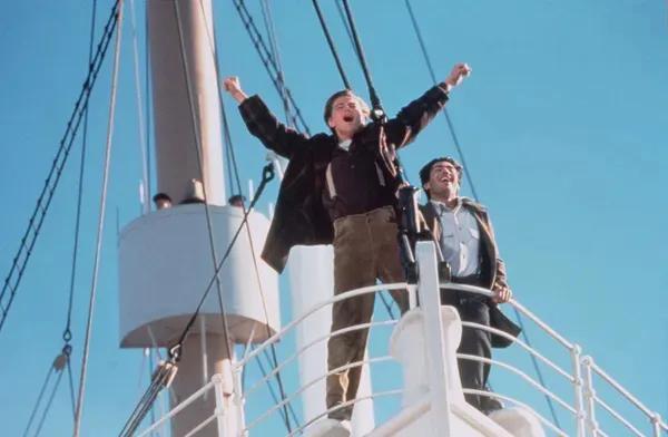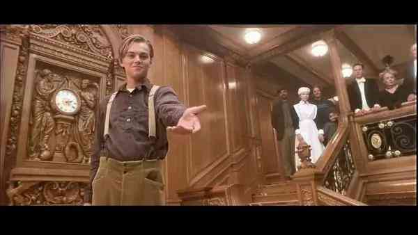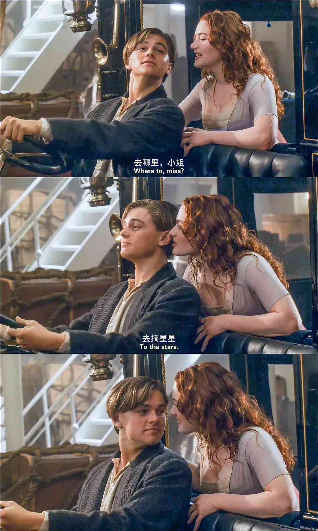 這天傍晚,夕陽之下,露絲在船頭找到杰克告訴了他自己內(nèi)心真實的答案,杰克高興極了,他讓露絲站在船頭的欄桿上張開雙手,自己在后面抱著她給予保護,像在飛翔一樣,二人墜入愛河,在悠揚的音樂聲中親吻彼此,這一幕真是美極了。