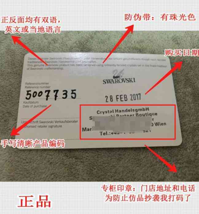 有人說早在2015年施華洛世奇就把保修卡取消了。事實(shí)上,情況并非完全如此。有些柜臺(tái)還配有保修卡。保修卡是享受售后服務(wù)的核心配件。正品??ㄉ嫌兄楣馍ㄓ蟹垂猓趁嫔戏接幸粭l防偽帶(清晰珠光色),右下角一欄是專柜印章信息(門店地址和電話),印章上方或左側(cè)是門店出貨日期,左側(cè)上方是手寫產(chǎn)品編號(hào)(7位數(shù)),編號(hào)和吊牌上以及包裝貼紙上的編號(hào)一致。