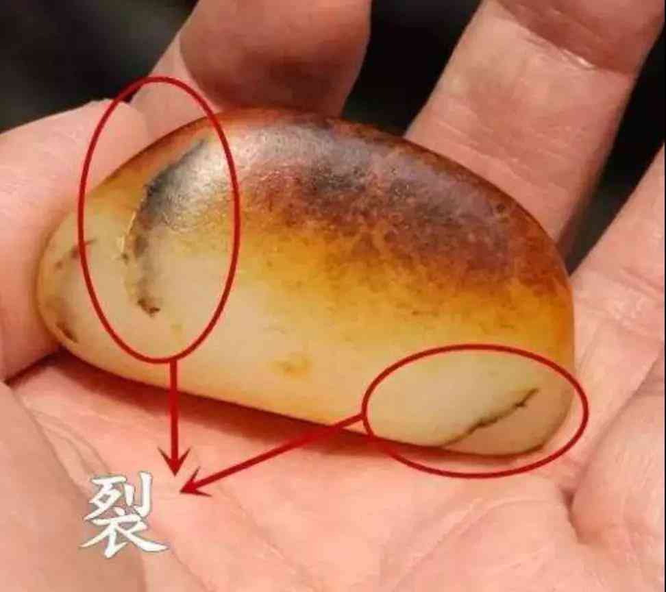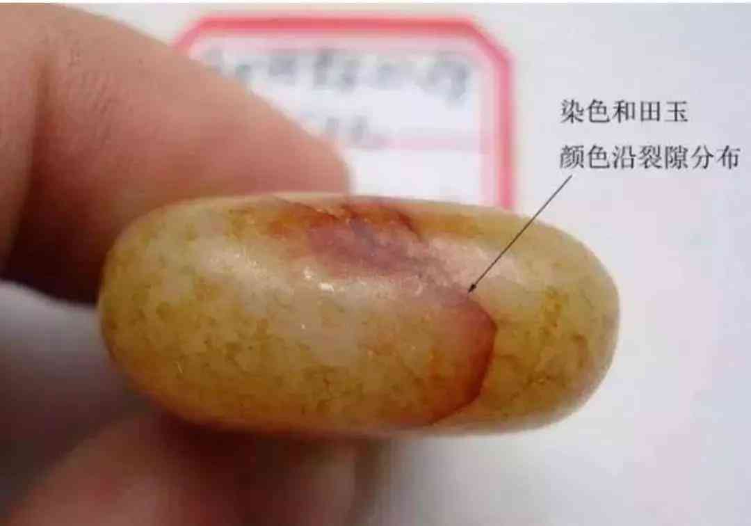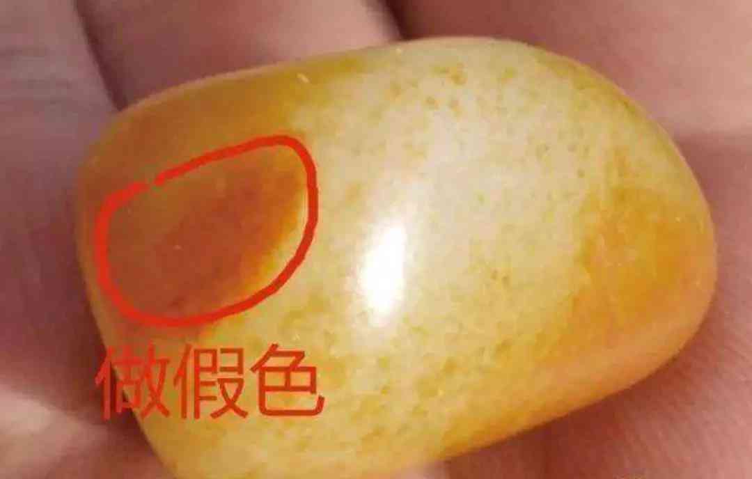 首先給大家展示一件非常明顯的灼色品,上圖就是市場常見的染色和田玉,仔細(xì)看一下這塊玉的顏色侵染狀態(tài),尤其是裂縫和深坑處顏色非常深,看到這樣的“籽料”果斷走開。