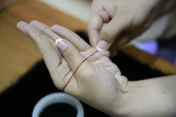 步驟一:把大拇指移到小拇指的指根處,并用細線測量手掌最寬處的周長。