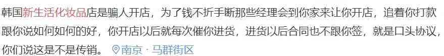 有資料顯示,新生活的主要發(fā)展模式是對外宣稱店鋪加業(yè)務員直銷,人員清一色來源于全國各大招聘市場,招聘內(nèi)容基本都是以韓國新生活化妝品為宣傳。新生活在其宣傳稿中也聲稱, 自己是一家直銷公司,在公司的運作上采用直銷模式。然而,在商務部直銷行業(yè)管理系統(tǒng)搜索“新生活”卻找不到任何信息??梢源_定的是,新生活在沒有取得直銷牌照的情況下,打直銷的擦邊球。同時,新生活的代理制度也正如網(wǎng)友所說的——和傳銷沒有差別。