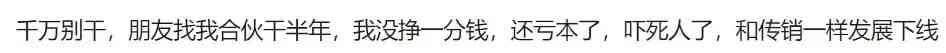 從新生活的營銷模式可以看出,投入越多,得到的利潤也就越多。但在高回報的背后,卻充滿了陷阱。新生活的代理制度實際上已滿足了傳銷的三大基本特點,即入門費、發(fā)展下線和團隊計酬。