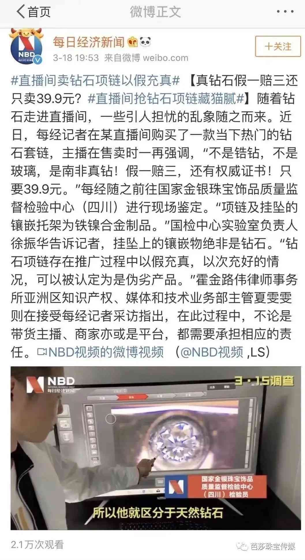 導(dǎo)讀: 前不久某直播間驚現(xiàn) 39.9 元的鉆石,主播在售賣時(shí)一再?gòu)?qiáng)調(diào)“不是鋯鉆,不是玻璃,是南非真鉆!假一賠三,還有權(quán)威證書!只...