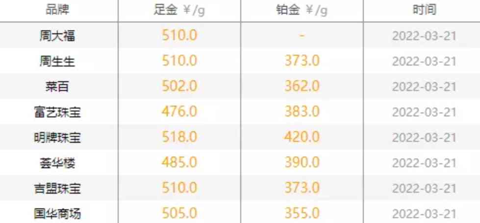 誠然,黃金飾品都有加工費(fèi),但是每克120元的加工費(fèi)確實(shí)有點(diǎn)離譜。像鉑金的回收價(jià)格甚至只有188元/克,99999黃金的回收價(jià)格也是382元/克。接下來我們看看各大金店的金價(jià)。國華商場今日金價(jià)足金990 502.0元/克,足金999 505.0元/克,鉑金950 355.0元/克,足鉑990 360.0元/克,足鉑999 365.0元/克,足鈀990 268.0元/克,足鈀999 268.0元/克。周生生今日金價(jià)足金飾品 510.0元/克,鉑金飾品 373.0元/克,金片 501.0元/克,生生金寶 464.0元/克。