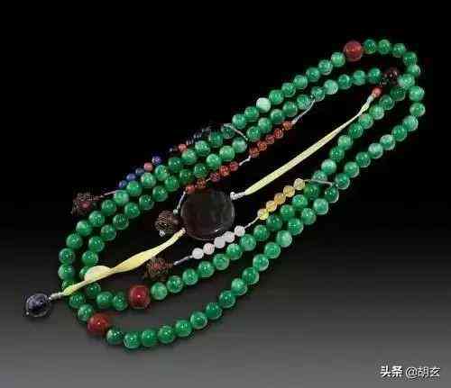 它由27 顆極為珍貴的翡翠珠串連而成,相傳是從清宮廷中外流而出,每顆珠子直徑15.4mm至19.2mm不等,相配絕倫,郁綠柔亮,且均出于同一塊原石。