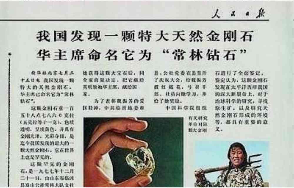 1978年,人民日?qǐng)?bào)刊發(fā)了一則消息,稱華主席接到民眾發(fā)現(xiàn)的一顆特大自然金剛石,并將其命名為“常林鉆石”。