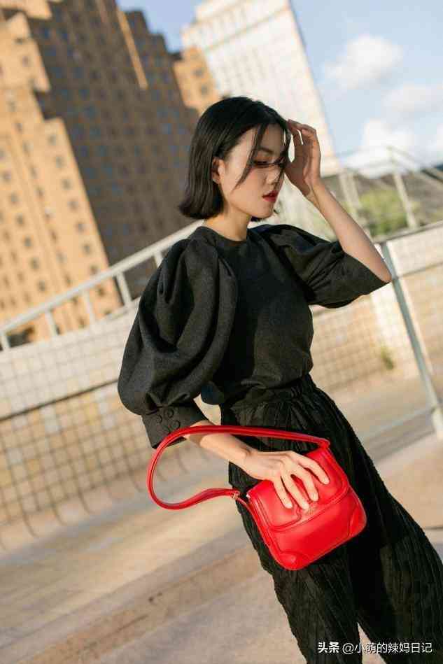 黑色是最顯瘦的顏色,自身有很好的收縮感,從視覺上縮緊全身,但一身黑很難穿出時髦感,整體偏暗沉,看著就壓抑。但這組穿搭中選擇了一個正紅色的方形包,利用飽和度極高的紅色營造亮點,瞬間打破黑色的單調(diào)與呆板。另一方面,真皮材質(zhì)的方形包與棉麻材質(zhì)的衣服在面料上形成對比,軟硬結(jié)合,更顯高級大氣。