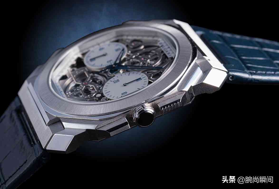 新款 Octo Finissimo Tourbillon Chronograph Skeleton Automatic 配備鉑金表殼,帶有兩個(gè)按鈕,側(cè)面有一個(gè)以白金制成的表冠。 表冠進(jìn)一步裝飾有黑色陶瓷嵌件以形成對(duì)比。