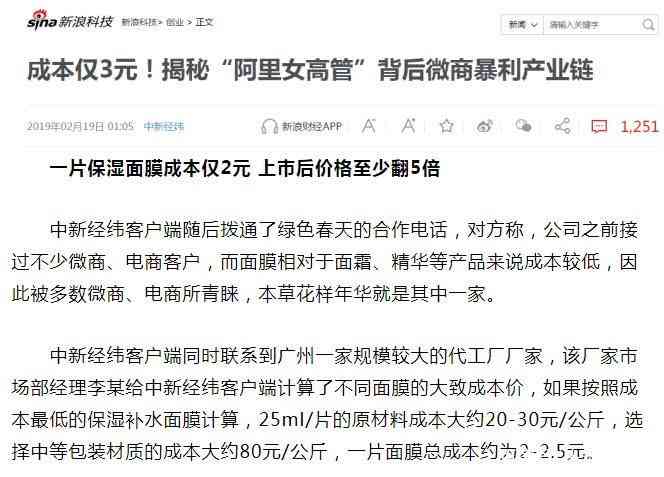 在“阿里女高管”王晗火了以后,有媒體調(diào)查到,其號(hào)稱組建獨(dú)立實(shí)驗(yàn)室研發(fā)出的“本草花樣年華小仙膜”,其實(shí)是由其它廠家代工的。王晗的面膜售價(jià)109元5片,而出廠價(jià)不足3元。
