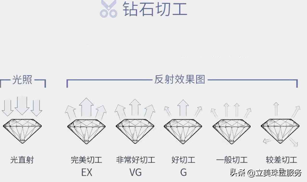 切割的方法影響著鉆石的閃耀程度,切割分為3個比例,拋光,修飾度三項。每項都有5個等級,等級分為EX、VG、G、F、P等5個等級。