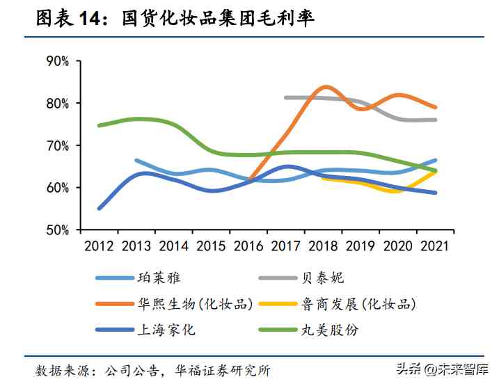 從產(chǎn)業(yè)鏈價(jià)值分布來看,中游品牌商占據(jù)話語權(quán),長期積累以及全方位能力打造 的品牌力支撐品牌商具有產(chǎn)業(yè)鏈環(huán)節(jié)中最高的毛利率。結(jié)合各公司財(cái)報(bào),化妝品產(chǎn)業(yè) 鏈上游環(huán)節(jié)毛利率為 25%-40%,而在透明質(zhì)酸領(lǐng)域具有絕對優(yōu)勢的華熙生物原料業(yè) 務(wù)部分的毛利率可高達(dá) 70%以上。代工環(huán)節(jié)加價(jià)率較低,毛利率范圍在 25%-30%。 中游品牌商毛利率和加價(jià)率均較高,毛利率可高達(dá) 60%-80%,產(chǎn)品、渠道、營銷等 全方位長期積累的品牌力為化妝品品牌商帶來溢價(jià)能力和定價(jià)權(quán)。