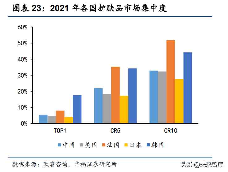 彩妝行業(yè)同樣可以看到成熟市場頭部品牌多由本土品牌構(gòu)成,2021 年美國、日 本 TOP15 彩妝品牌中,本土品牌分別有 11 個(gè)、14 個(gè),而中國市場本土品牌僅占 4 個(gè)。對比 2012 和 2021 年中國彩妝市場,TOP2 由外資品牌美寶蓮、歐萊雅占據(jù)主要份額轉(zhuǎn)變?yōu)閲浕ㄎ髯印⑼昝廊沼浳痪忧岸?,國產(chǎn)品牌產(chǎn)品力明顯提升。2012-2021 年中國彩妝行業(yè)市場集中度降幅明顯,國產(chǎn)彩妝品牌百花齊放打破 國際彩妝的壟斷格局。2012 年中國彩妝市場 TOP1 市占率/CR5/CR10 分別為 21.2%/44.4%/54.9%,2021 年分別降低至 6.8%/30.3%/48.1%。橫向五國對比中, 中國彩妝市場集中度僅次于法國,花西子、完美日記等新銳品牌爆發(fā)引領(lǐng)彩妝審美的 國潮崛起。