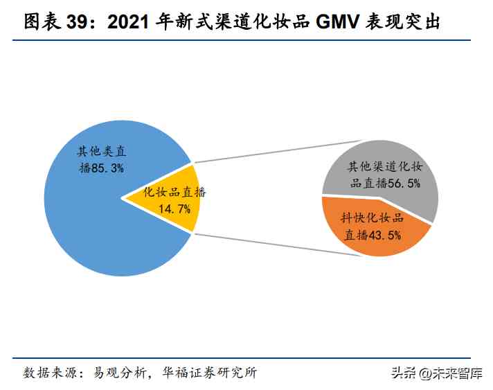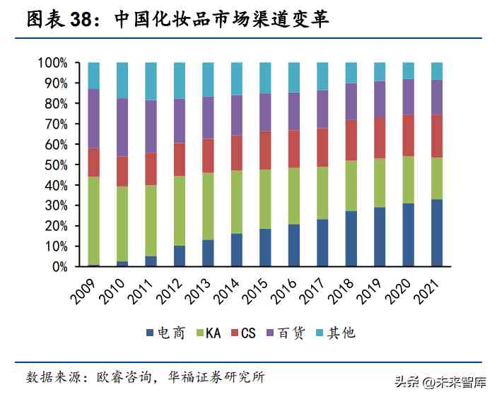 銷售向線上和專業(yè)渠道轉(zhuǎn)移,新式渠道迅速發(fā)展。近十年化妝品行業(yè)銷售渠道逐 步由線下轉(zhuǎn)移至線上,互聯(lián)網(wǎng)紅利助力電商渠道崛起,2010-2021 年,化妝品行業(yè)電 商渠道銷售占比由 3%逐年提升至 33%,已成為.大渠道;KA(商超渠道)、百貨 等傳統(tǒng)渠道銷售占比下降較快,線下渠道中僅 CS(化妝品專營店)的占比呈增長態(tài) 勢。同時(shí),近年來新網(wǎng)絡(luò)購物模式和新興平臺(tái)起勢,社交電商、短視頻、直播電商等 新線上渠道涌現(xiàn),抖音、快手等直播電商成為爆發(fā)較快的新增長點(diǎn)。根據(jù)易觀分析的 數(shù)據(jù),2021 年,化妝品類直播的 GMV 達(dá)到 2000 億元,在整體直播 GMV 中占比 14.7%;其中抖音、快手化妝品直播銷售額為 870 億元,在化妝品直播中占比高達(dá) 43.5%。
