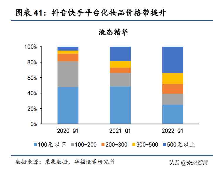 抖快平臺(tái)結(jié)構(gòu)優(yōu)化,產(chǎn)品價(jià)格帶上行趨勢明顯。渠道拓展過程中要跟蹤不同平臺(tái) 的產(chǎn)品價(jià)格結(jié)構(gòu),化妝品品牌在進(jìn)入新渠道時(shí)往往先通過較為成熟且價(jià)格較低的產(chǎn)品 入手,以匹配平臺(tái)用戶契合度,逐漸培養(yǎng)品牌在該平臺(tái)的消費(fèi)者心智后,產(chǎn)品側(cè)重向 高毛利的貴價(jià)產(chǎn)品轉(zhuǎn)變,從而拉升新渠道的盈利能力。抖音快手渠道逐漸從新興性價(jià) 比平臺(tái)向主力產(chǎn)品銷售平臺(tái)發(fā)展,已經(jīng)成為頭部化妝品品牌的兵家必爭之地, 2020Q1-2022Q1,抖音快手平臺(tái) 500 元以上的液態(tài)精華占比由 5%提升至 34%,500 元以上的乳液/面霜占比由 7%提升至 31%,整體產(chǎn)品價(jià)格水平上移。