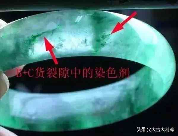 B+C貨的顏色侵入裂縫,所以看起來(lái)一條一條的,像絲瓜瓤的色形,不似天然翡翠般的脈狀分布。