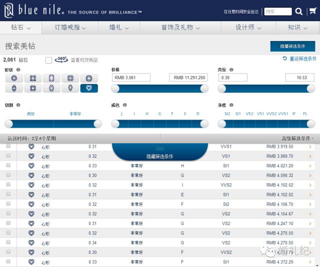 另外小犀還想提一下圓鉆和異形鉆。買鉆戒新娘們多選擇常規(guī)的圓鉆,認(rèn)為圓形鉆顯大,升值快。但其實(shí)這是個(gè)誤區(qū)。在同等標(biāo)準(zhǔn)下,50分圓鉆的錢就能買到1克拉的異形鉆!基本50分的圓形鉆戒價(jià)格大概在1w-3w之間,而bluenile(國(guó)際知名在線鉆石珠寶零售商)官網(wǎng)上,異形鉆的價(jià)格,50分的心形鉆大概在5000-15000之間。