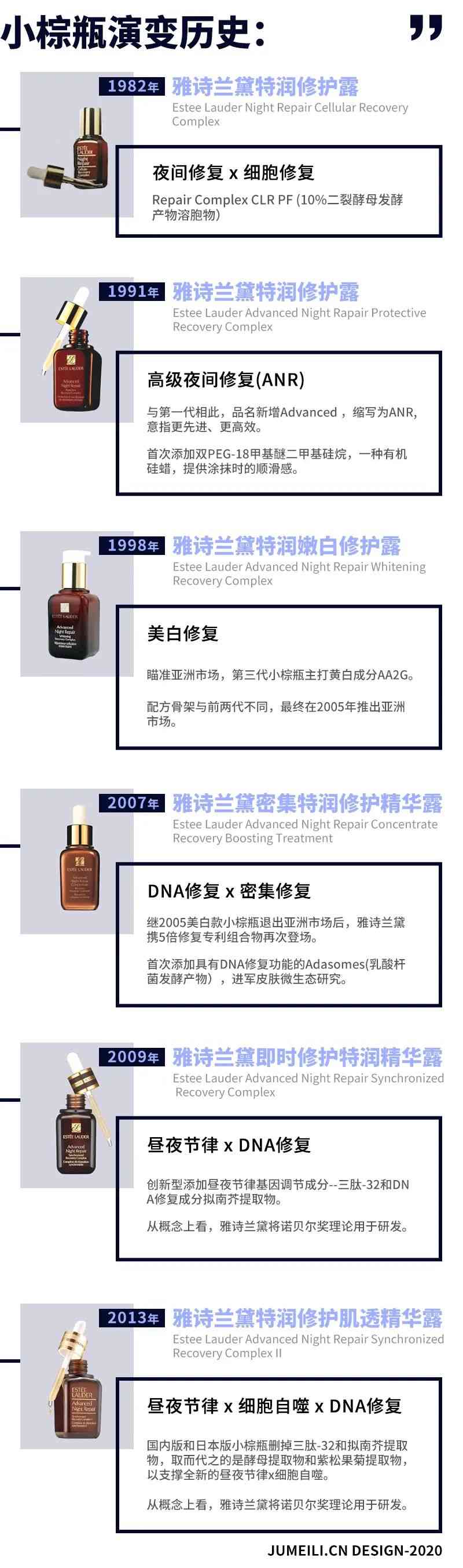 1982年,.代小棕瓶推出,至今39年間經(jīng)過了6次產(chǎn)品升級(jí)。這個(gè)過程中,產(chǎn)品的配方成分不斷更新,產(chǎn)品概念也一路從“夜間修復(fù)”“細(xì)胞修復(fù)”走向“晝夜節(jié)律”“細(xì)胞自噬”和“DNA修復(fù)”。(小棕瓶的迭代之路詳見聚美麗往期文章《單品之王小棕瓶》)
