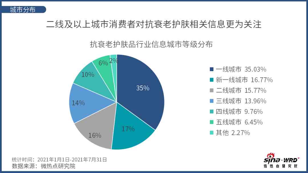 2021年,新浪微熱點(diǎn)研究院發(fā)布的《抗衰老護(hù)膚品行業(yè)網(wǎng)絡(luò)關(guān)注度分析報(bào)告》顯示,從關(guān)注抗衰老行業(yè)相關(guān)信息城市分布可見,消費(fèi)水平更高的一線及新一線城市合計(jì)占比超五成,二線城市占比為15.77%,二線以下城市占比相對(duì)較少。
