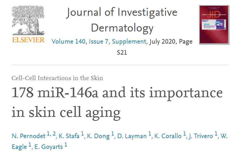 2020年,雅詩蘭黛在JID(Journal of Investigative Dermatology,調(diào)查皮膚病學(xué)雜志)上發(fā)表了一篇題為《178 miR-146a and its importance in skin cell aging》的論文。
