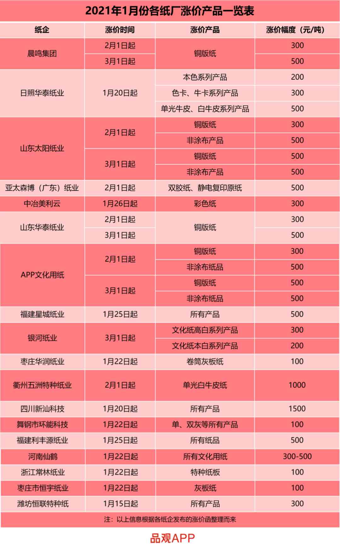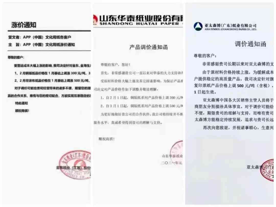品觀APP發(fā)現(xiàn),進(jìn)入1月以來(lái),國(guó)內(nèi)有近20家紙企接連發(fā)布漲價(jià)通知函,其中不乏華泰紙業(yè)、晨鳴集團(tuán)、亞太森博、APP紙業(yè)等在內(nèi)的多家行業(yè)龍頭。