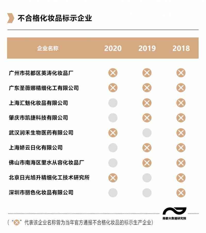 南都大數(shù)據(jù)研究院比對發(fā)現(xiàn),國家藥監(jiān)局今年通報的飛檢問題企業(yè)中,有9家曾是不合格化妝品的標(biāo)示企業(yè)(如圖),存在出品不合格化妝品的可能。其中,廣州市花都區(qū)英濤化妝品廠、廣東圣薇娜精細(xì)化工有限公司曾連續(xù)三年出現(xiàn)在不合格化妝品的標(biāo)示企業(yè)名單中。