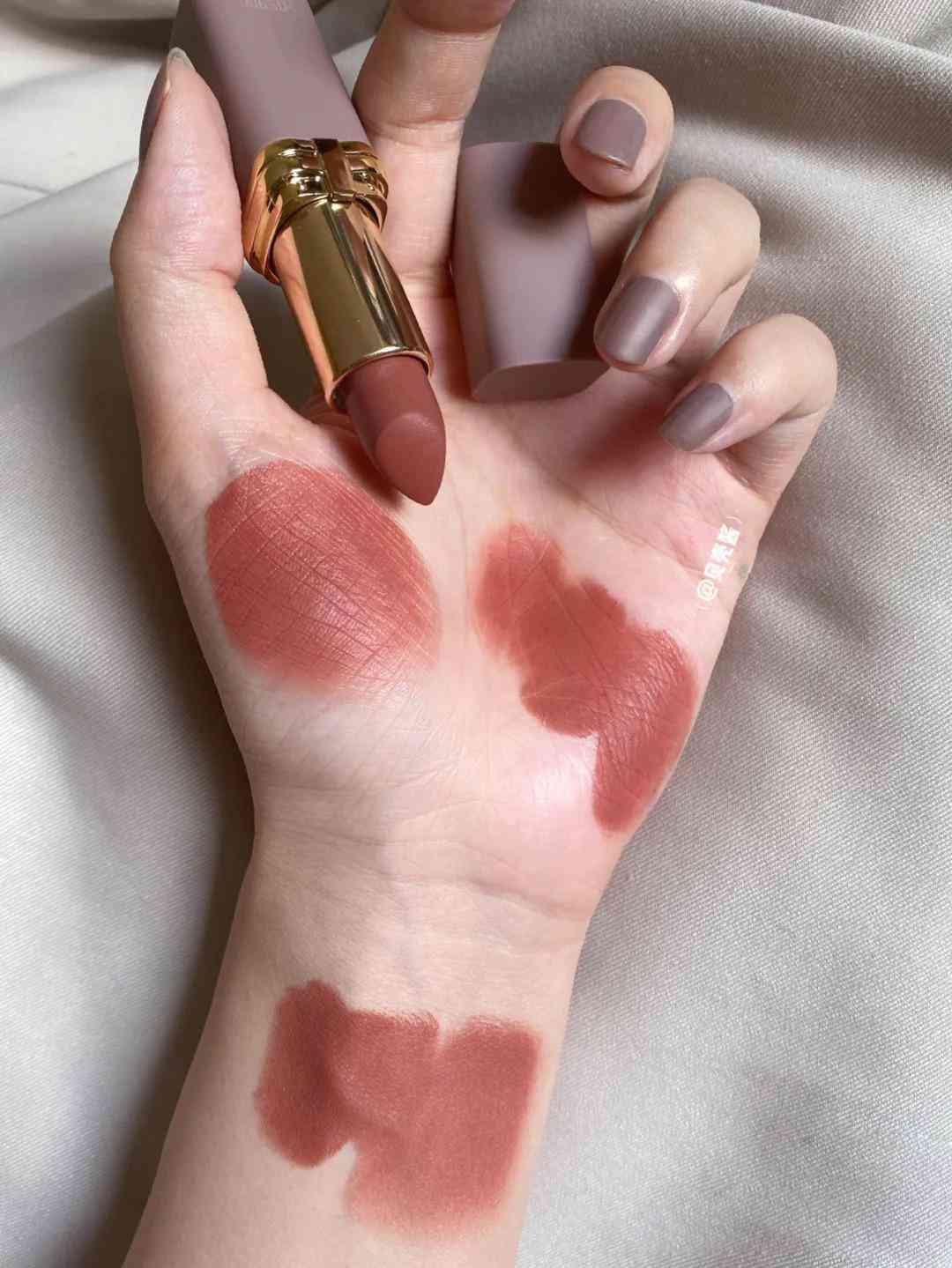 真的很冷門的顏色,但是它是王炸奶茶色,顏色好看又好用。飽和度偏低,不會不顯氣色,是帶著土調(diào)的奶茶色,上嘴溫柔又很顯白,厚涂簡直就是溫柔御姐本人了,顏色超級好看,怎么就沒人知道呢。是很順滑的啞光質(zhì)地,很舒服,不會拔干,不過就是膏體比較軟,使用的時候不要轉(zhuǎn)太多出來。