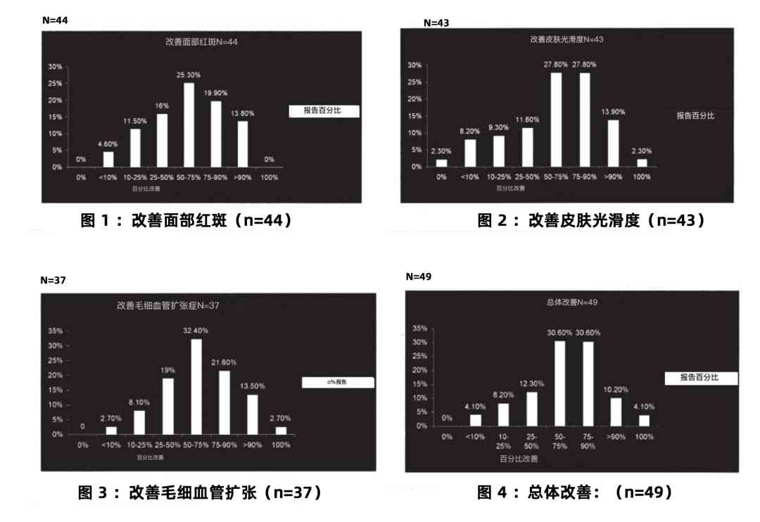 「世界光子嫩膚之父」Dr.Patrick Bitter 教授的研究顯示,70% 的受試者報(bào)告毛細(xì)血管擴(kuò)張的外觀改善了 50% 或更大;38% 的人報(bào)告毛細(xì)血管擴(kuò)張改善了 75% 或更多[12]。