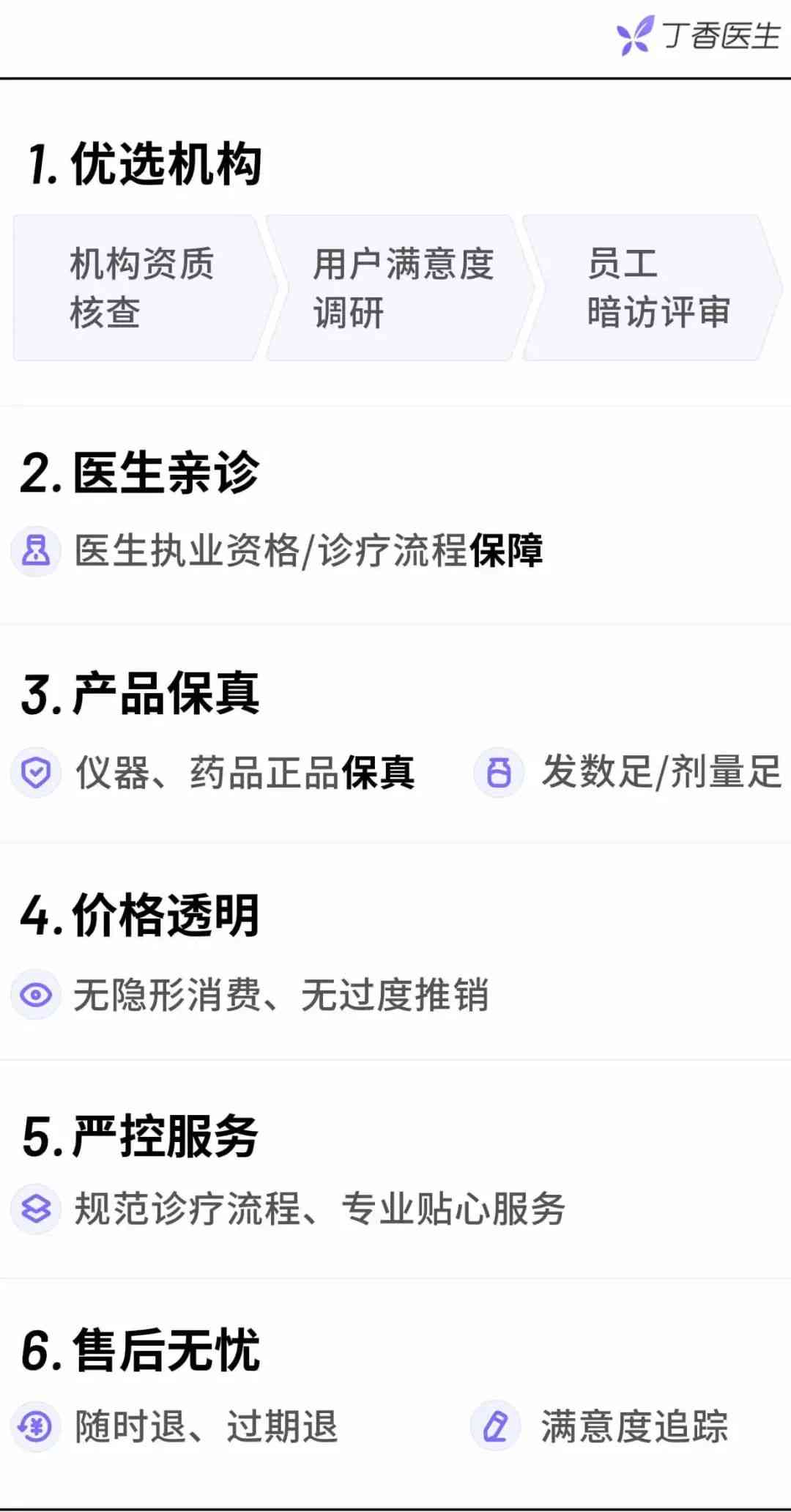 為了幫助更多的用戶安心搭乘醫(yī)美這輛車,丁香醫(yī)生優(yōu)選三正規(guī)機(jī)構(gòu)為你把關(guān),更有以下服務(wù)保障。