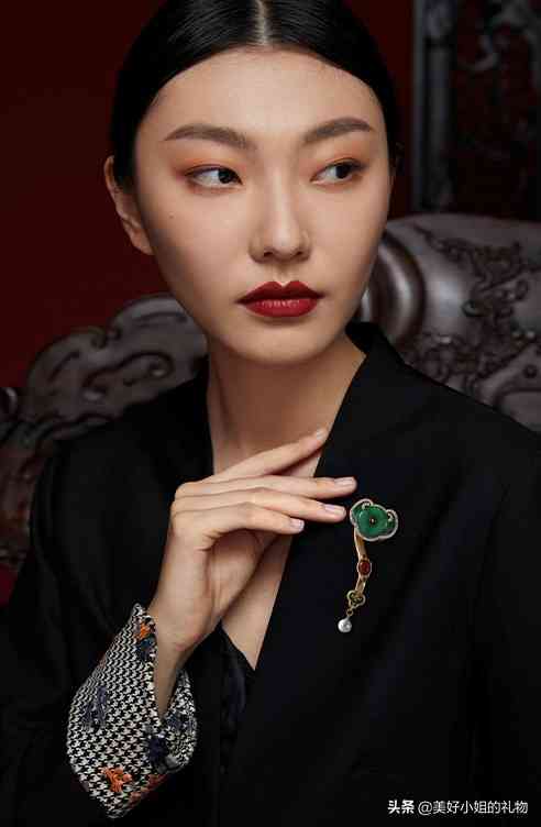 這是一款靈芝玉如意造型的胸針,如意頭采用碧綠的玉髓,并以閃耀的鋯石勾勒輪廓,長柄中間鑲嵌了紅瑪瑙,尾部用祥云和珍珠點(diǎn)綴,制作過程中用到了冷琺瑯、景泰藍(lán)、點(diǎn)翠等古法工藝,滿滿的細(xì)節(jié)感,尤其適合送給愛穿旗袍的媽媽們。