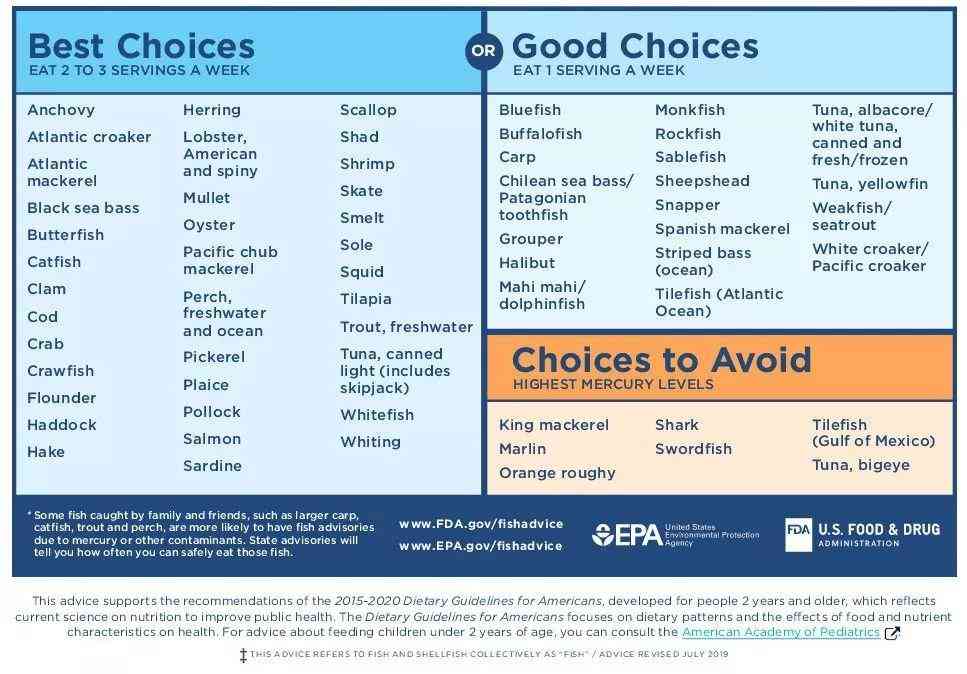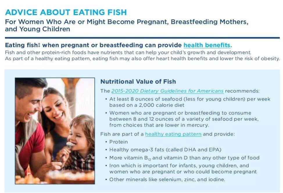 此前,F(xiàn)DA(美國食品藥品監(jiān)督管理局)制定了一項(xiàng)針對懷孕或即將懷孕的婦女、哺乳的母親以及 2 歲以上兒童的飲食建議,幫助他們在選擇營養(yǎng)豐富且安全的魚類時(shí)做出明智的選擇。