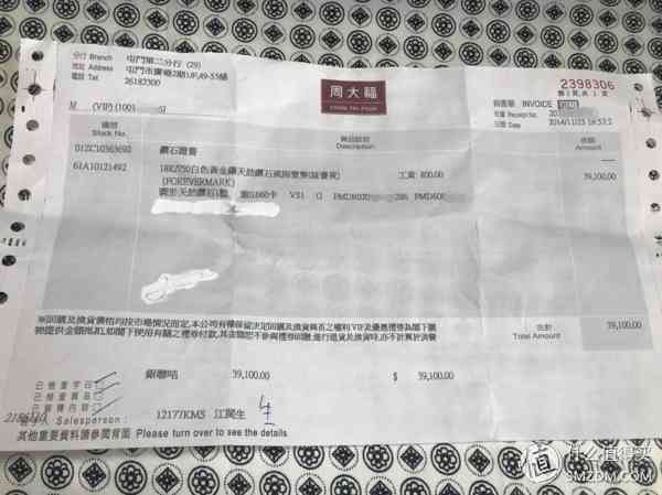 當時購買的收據(jù),購自香港屯門的周大福。港幣39,100,當時的匯率比較低,大概合人民幣32,000左右。