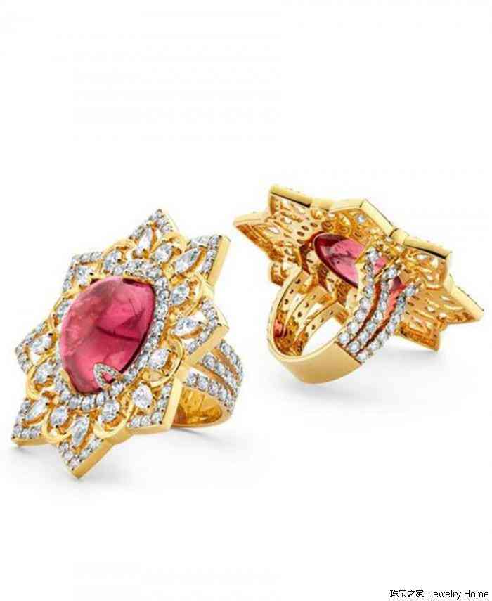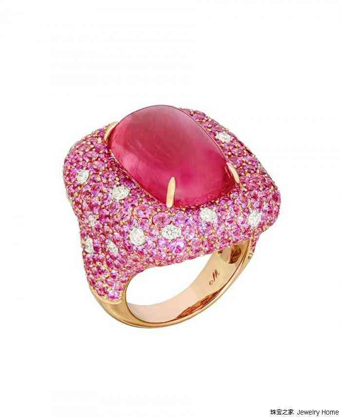 Marbella 凸圓形盧比來(lái)戒指,鑲飾一顆17.66克拉凸圓形盧比來(lái),周圍鑲飾粉色藍(lán)寶石和鉆石,售價(jià):$ 20,500