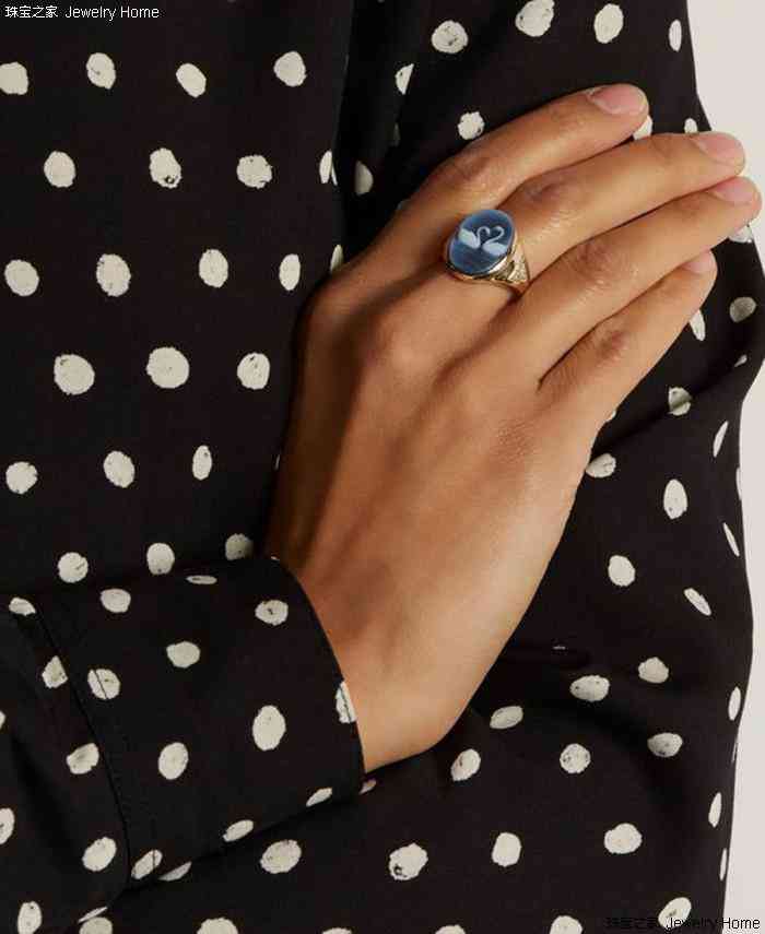Jacquie Aiche 的這款風(fēng)格獨(dú)特的戒指上鑲有一塊橢圓形的皇家藍(lán)瑪瑙,雕刻著兩只優(yōu)雅的天鵝,售價(jià):£ 2,500