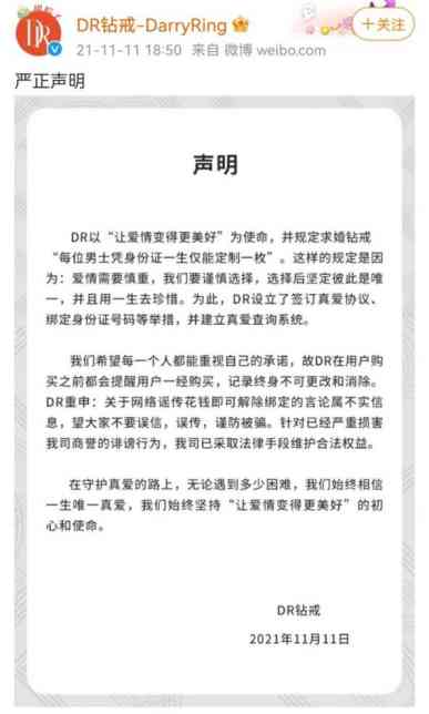 長期以來,DR最大的品牌特色就是“男士一生憑借身份證只能購買一枚”,顧客在購買求婚鉆戒時需要簽署《真愛協(xié)議》、自愿綁定產(chǎn)品受贈方姓名,此信息可以在官網(wǎng)驗證查詢,且終生不可修改、二次購買,一系列流程被調(diào)侃為“真愛營銷”。