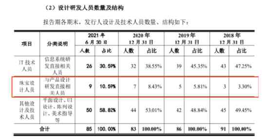 但數(shù)據(jù)顯示,2021年上半年,該公司的珠寶設(shè)計人員僅有9人,占總?cè)藬?shù)的10.59%,主要通過聘請外部設(shè)計團(tuán)隊研發(fā)、合作廠商選款等方式進(jìn)行新品研發(fā)。2021年上半年,公司34個新增款式中,內(nèi)部設(shè)計師設(shè)計的數(shù)量僅為2款,其余皆為合作廠商設(shè)計。